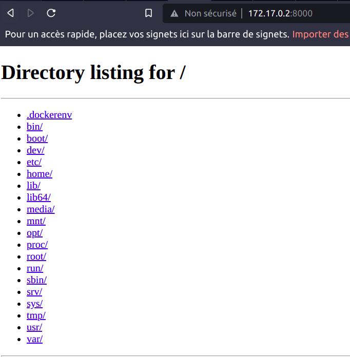 Serving HTTP on 0.0.0.0 port 8000 (http://0.0.0.0:8000/) ...Essayons d'accéder au serveur HTTP sur notre navigateur avec l'IP de notre conteneur :