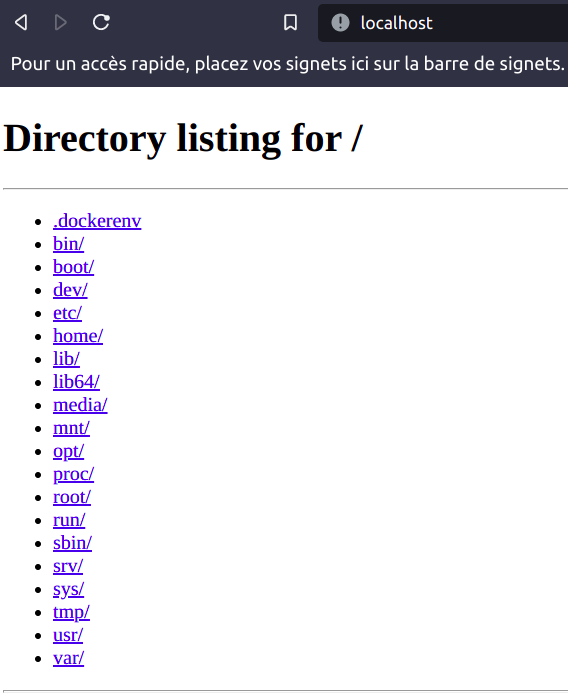python3 -m http.serverCette fois-ci, accédons au serveur HTTP sur notre navigateur non pas avec l'IP mais du conteneur... mais en localhost !